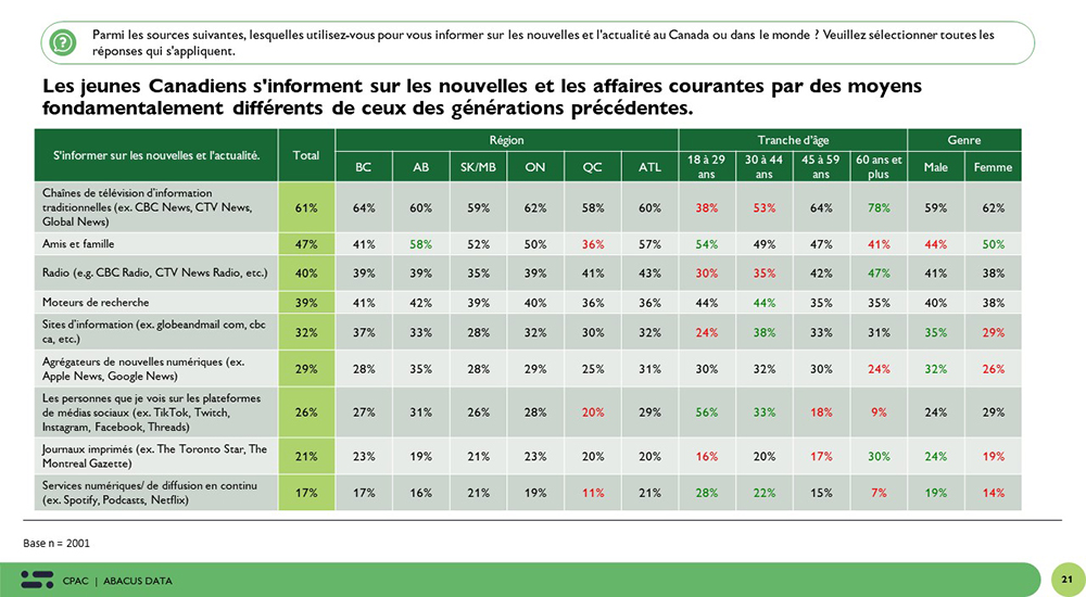 À mesure que ces préoccupations augmentent, de moins en moins de personnes obtiennent leurs nouvelles et leurs informations auprès des organes de presse traditionnels ou font confiance aux informations qu'elles reçoivent. Quatre-vingts pour cent des personnes interrogées mettent en doute la véracité des informations qu'elles ont lues ou entendues, bien que 74 % se disent confiantes dans leur capacité à discerner le vrai du faux. Les jeunes Canadiens, ceux qui ont entre 18 et 29 ans, s'informent via les réseaux sociaux (56 %) ou auprès de leur famille et de leurs amis (54 %), alors que 61 % des personnes interrogées, dont la plupart ont 60 ans ou plus, s'informent auprès des organes de presse traditionnel.