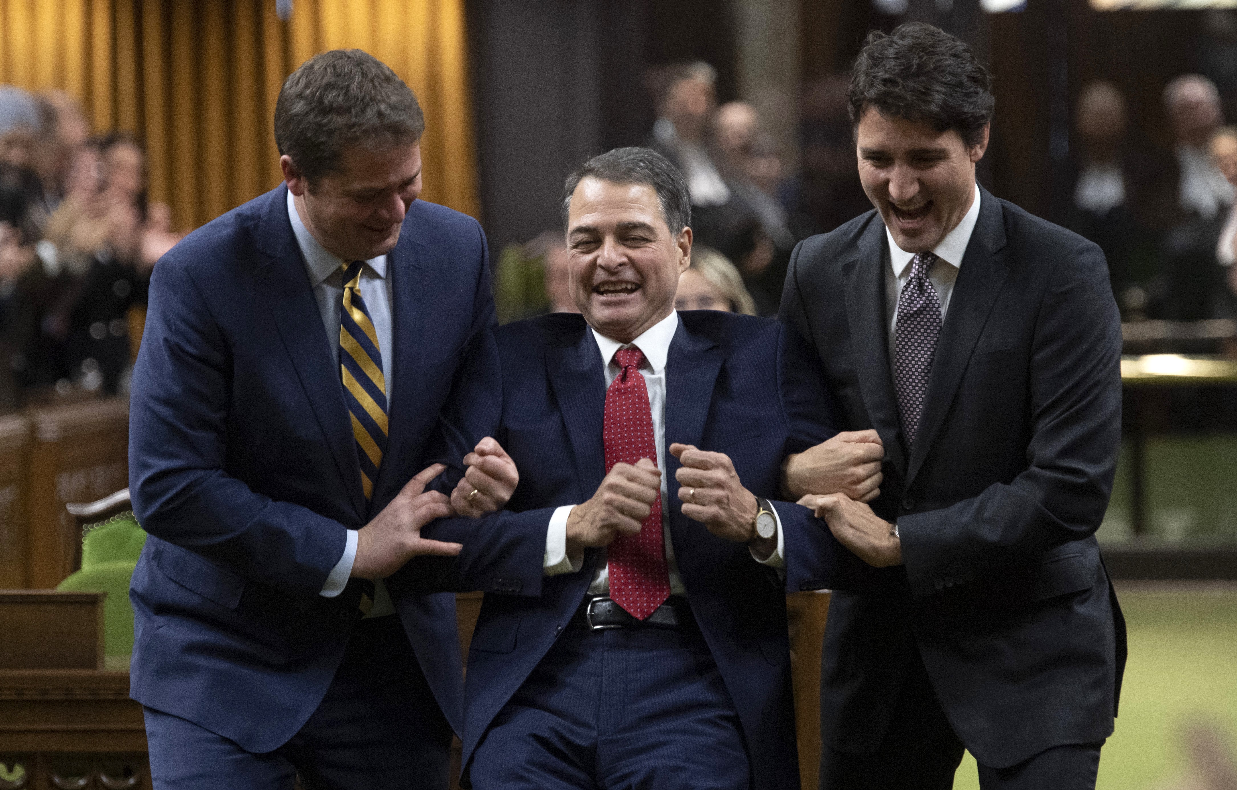 Prime Minister Justin Trudeau and Conservative Leader Andrew Scheer "drag" Anthony Rota to the chair after his election as Speaker of the House of Commons in 2019. THE CANADIAN PRESS/Adrian Wyld