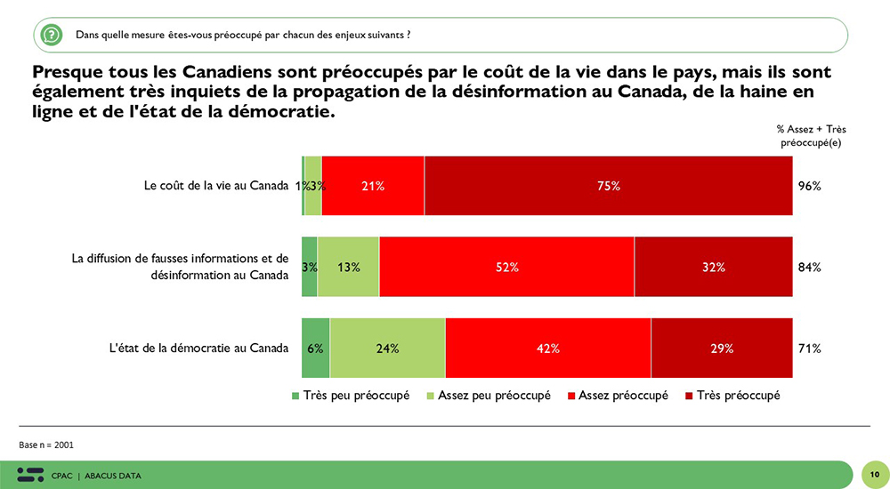 Les responsables de la sécurité, dont le SCRS dans son rapport (S'ouvre dans une nouvelle fenêtre) annuel publié le 7 mai, préviennent que la désinformation est l'une des plus grandes menaces pour le Canada, et plus des trois quarts des Canadiens partagent cette inquiétude, selon un sondage Abacus Data commandé par CPAC en avril. Quatre-vingt-quatre pour cent des personnes interrogées ont affirmé qu'elles étaient au moins quelque peu préoccupées par la diffusion de fausses informations et de désinformation et que cette inquiétude pouvait avoir un effet sur notre démocratie.